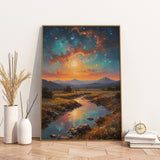 This captivating artwork features a mesmerizing landscape with a vibrant sunset reflecting on a serene river, set against a backdrop of majestic mountains under a starlit sky. The painting is created in a vivid impressionistic style, using bold brushstrokes and rich colors, making it an enchanting addition to any art collection.